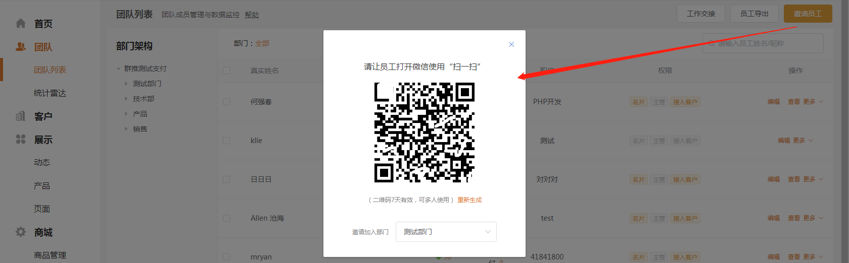 答:登录后台点击团队列表--右上角邀请员工--扫码识别二维码,完善资料即可