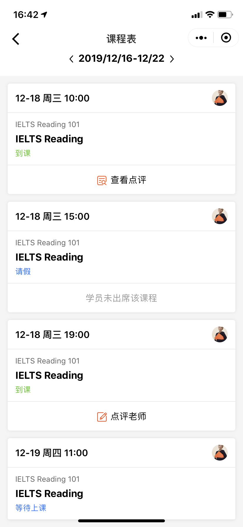 新增教学点评功能,现在在上课考勤后,学员可以在【小程序-我的-我的课程】查看所有课程信息,并针对老师的上课质量进行点评。