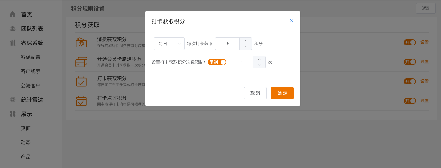 打卡获取积分:商家可决定用户每日/周/月打卡获取积分的数量,以及获取积分的上限,防止用户恶意套取积分;