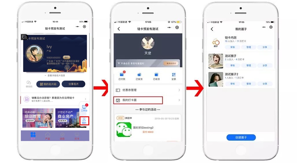 如果您是销售人员,当您进入"打卡广场后",点击"创建圈子"即可快速创建(演示图如下:)