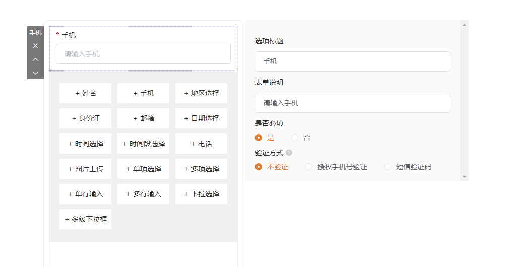 3.手机:可选择使用两种验证方式,授权手机号与短信验证码验证的方式,使用场景为防止用户填写手机号错误或者用户乱填手机号,其中选择短信验证码功能需要企业充值足够的短信数量,充值需要联系客服进行操作。