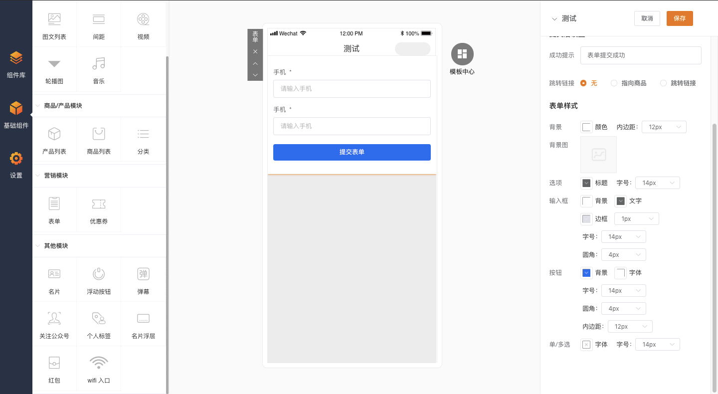 功能介绍:通过企业后台-营销-表单-创建表单,通过添加相应组件来创建表单,可用来绑定商品收集客户信息、添加到小程序页面作为客户反馈表格内容、开通会员时收集客户详细资料等;
