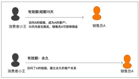 有效期内,用户访问了其它分销员(分销员B)的链接,将与其它分销员(分销员B)建立客户关系,若产生购买,分销员B可获得佣金。