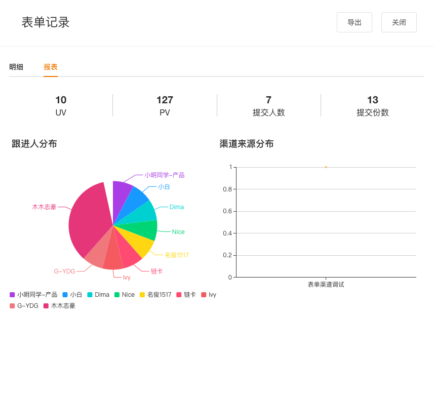 功能说明:在PC后台的表单数据处,除了查看用户提交的原始数据,新增表单的数据分析功能,包括当前表单的UV、PV、提交人数、提交份数、跟进销售分布、表单渠道来源;另一方面支持对表单中的单选、多选、下拉选择、时间段等字段进行可视化数据展示,方便用户快速了解用户提交数据的情况;