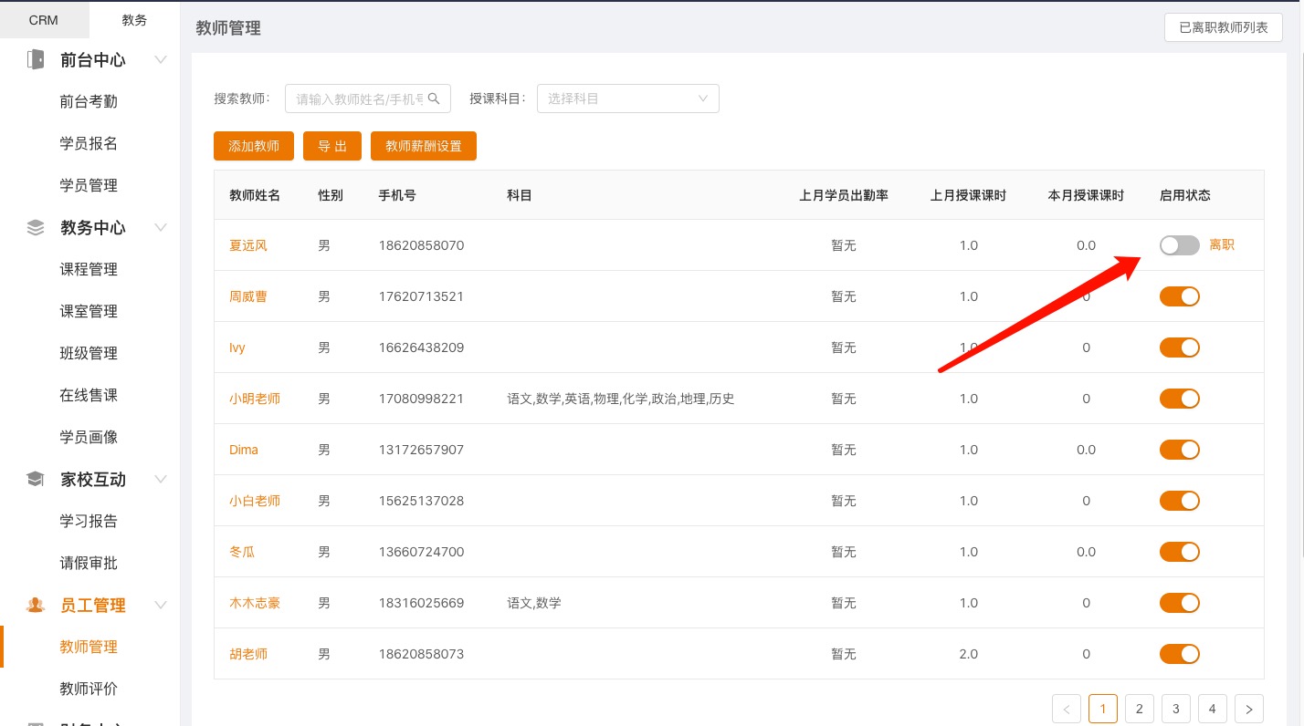 1)首先关闭教师的【启用状态】,在关闭【启用状态】时,如果当前教师有排课的班级,会自动把教师从该班级进行解绑和移除,【启用状态】关闭后,系统会显示离职操作按钮;