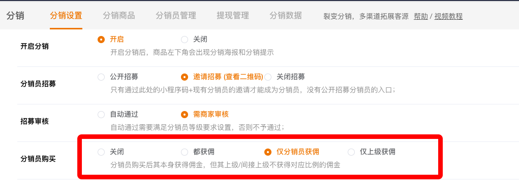 3)仅分销员获佣——分销员购买后其本身获得佣金,但其上级/间接上级不获得对应比例的佣金;