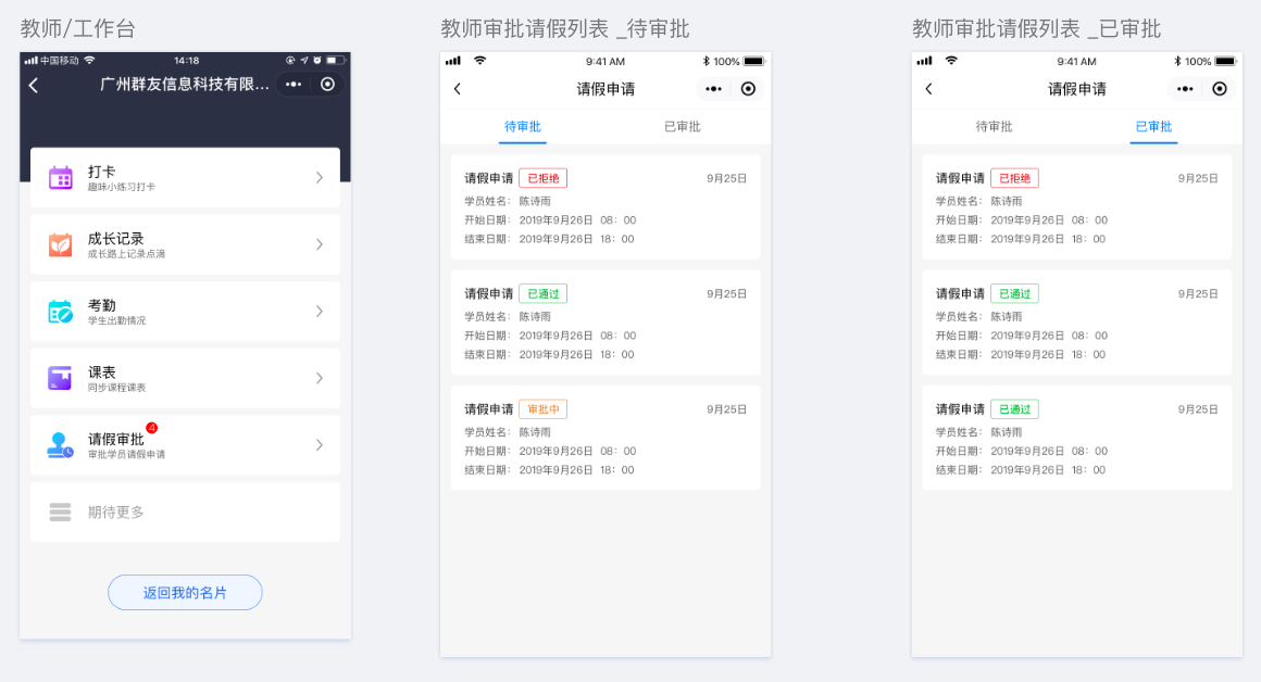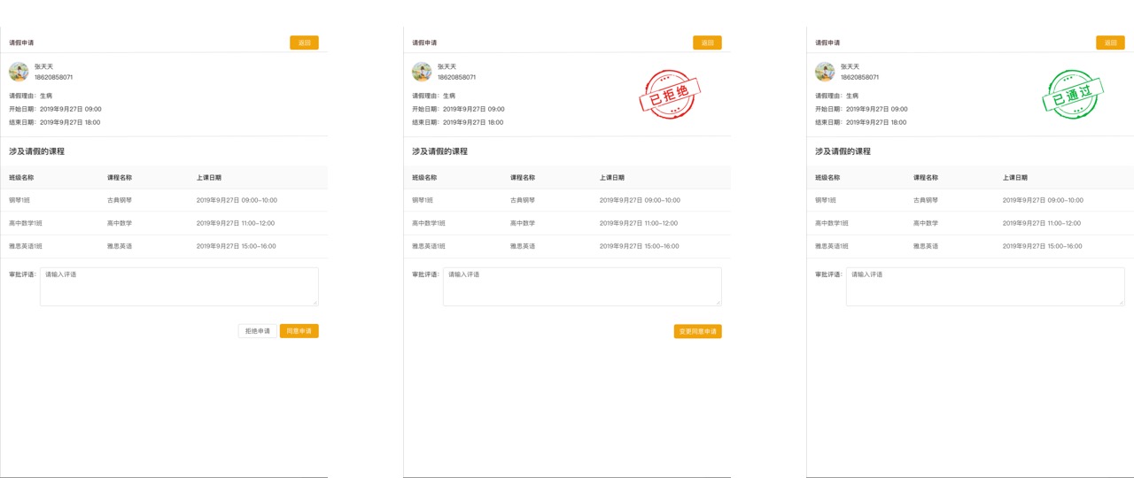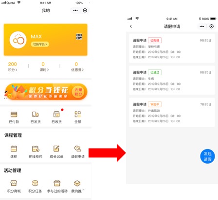 功能说明:教育版学员现支持在手机端请假申请,教师可在教师工作台以及PC后台处理;学员在请假时只需要输入请假的开始和截止日期,期间涉及的课程都会自动被处理,无需教师/教务人员按照学员所报课程一一去处理;