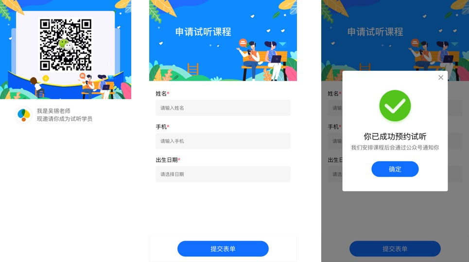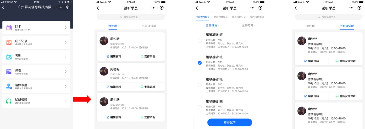 功能说明:机构通过发出试听课程邀请码,家长在报名后老师可以直接在教育版工作台的“试听管理”中直接处理报名试听学员的申请,并按照当前的课程安排将其加入指定班级试听;除此之外,教师还可以通过后续对学员的跟进,进一步完善学员的资料信息;