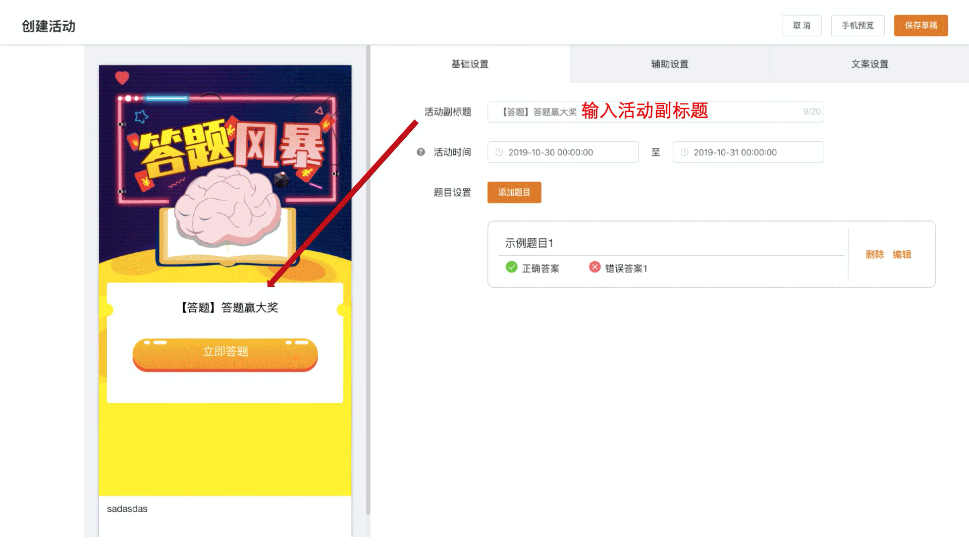 功能说明:答题风暴活动支持商家在后台自定义创建1-10个单选题,对于答对一定数量的参与者即可参与商家准备的现金红包或者优惠券。商家可以通过“开启获取复活机会”让用户通过分享再次获取答题机会,从而达到裂变效果;当然,对于参与活动的用户,商家也可以预设表单,这样用户领取奖品前必须留下资料才能领取奖品(现金红包/优惠券),充分实现获取客户信息的作用;
