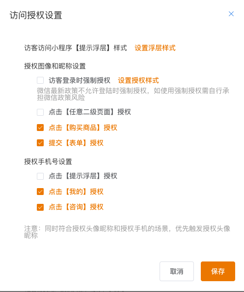 点击【设置】,打开浮层,可以根据不同场景决定是否需要授权【头像昵称】或【手机号】
