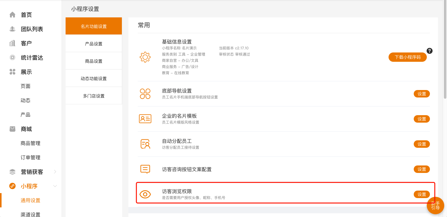 微信在7月13日更新了 小程序内用户账号登陆规范调整和优化建议 ,为了符合新规定,本次我们对小程序授权场景功能进行了升级,本次新版设置功能入口在【企业后台】-【小程序】-【通用设置】-【访客浏览权限】